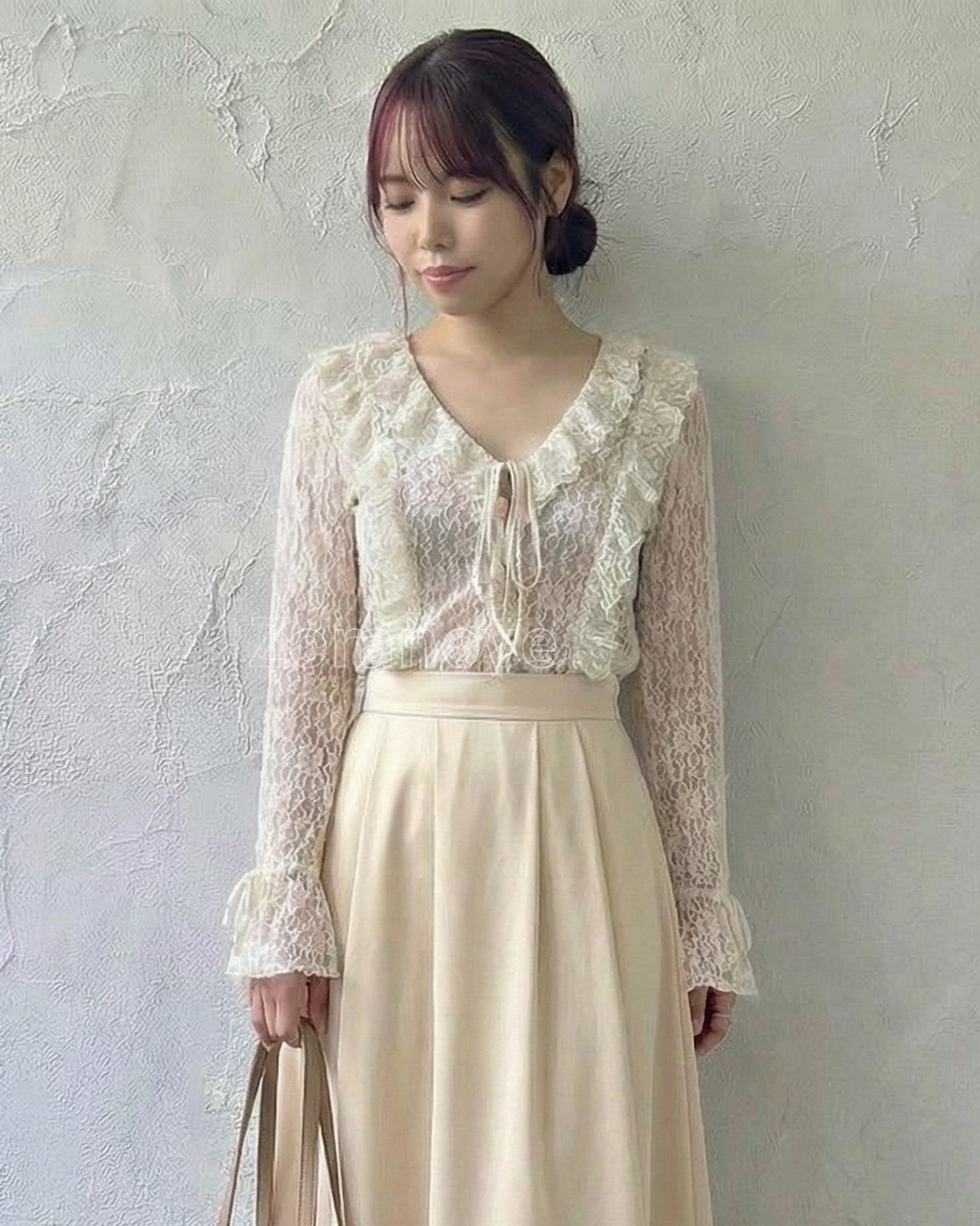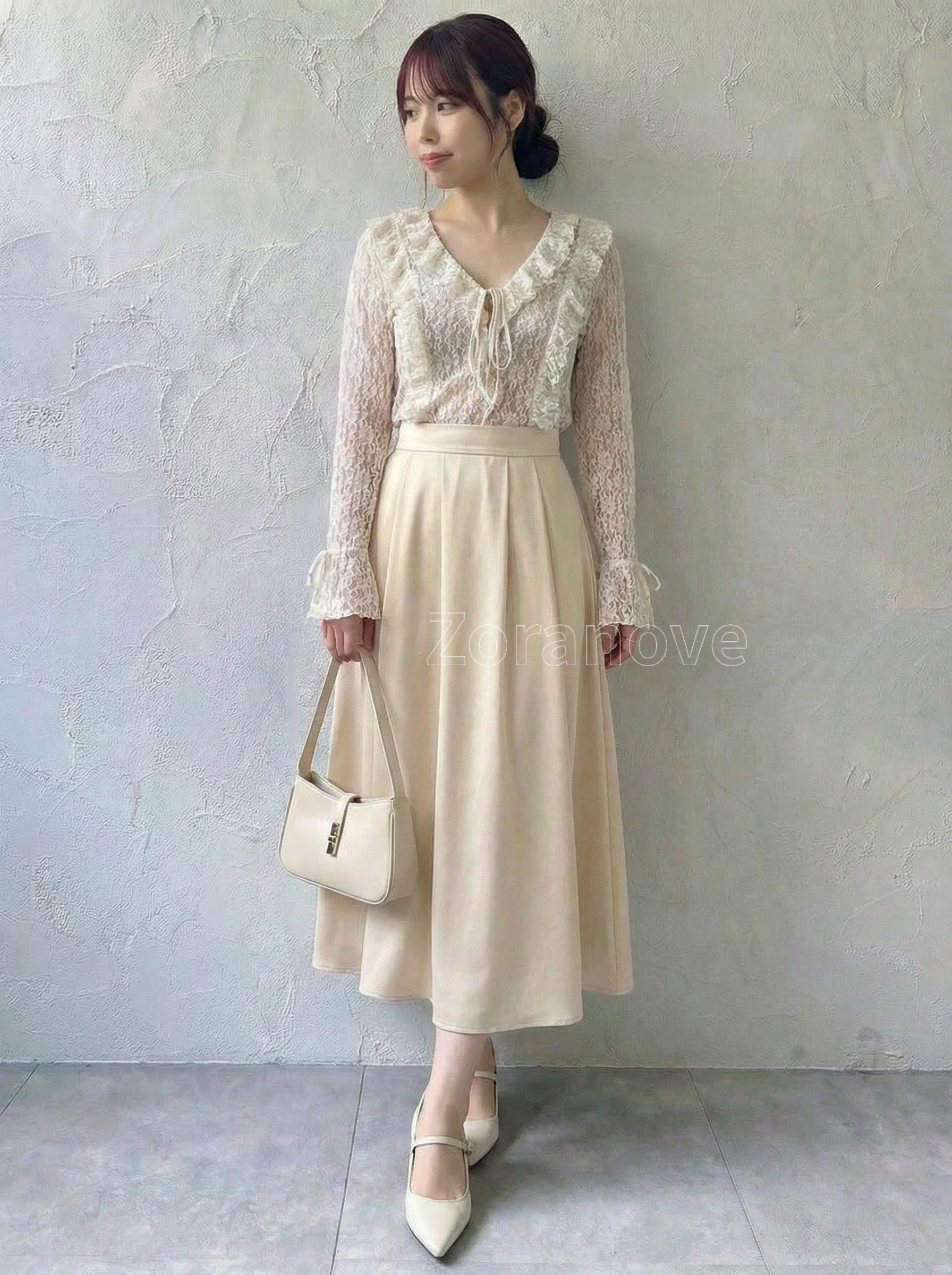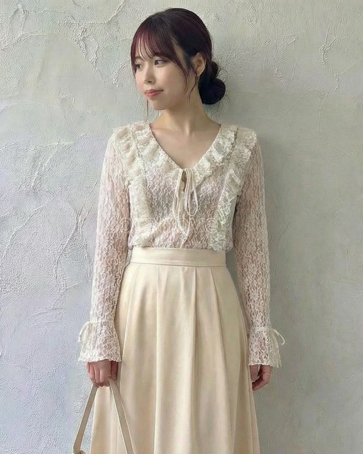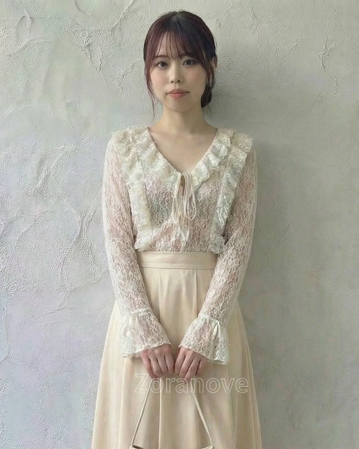 深V領口搭配前中綁帶設計,領口邊緣延伸精緻荷葉邊,拉長頸部與上半身比例,視覺更俐落修長。