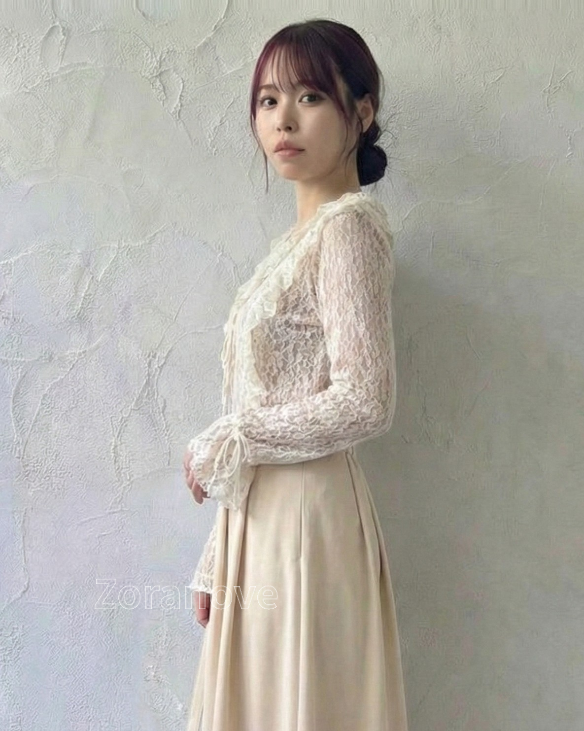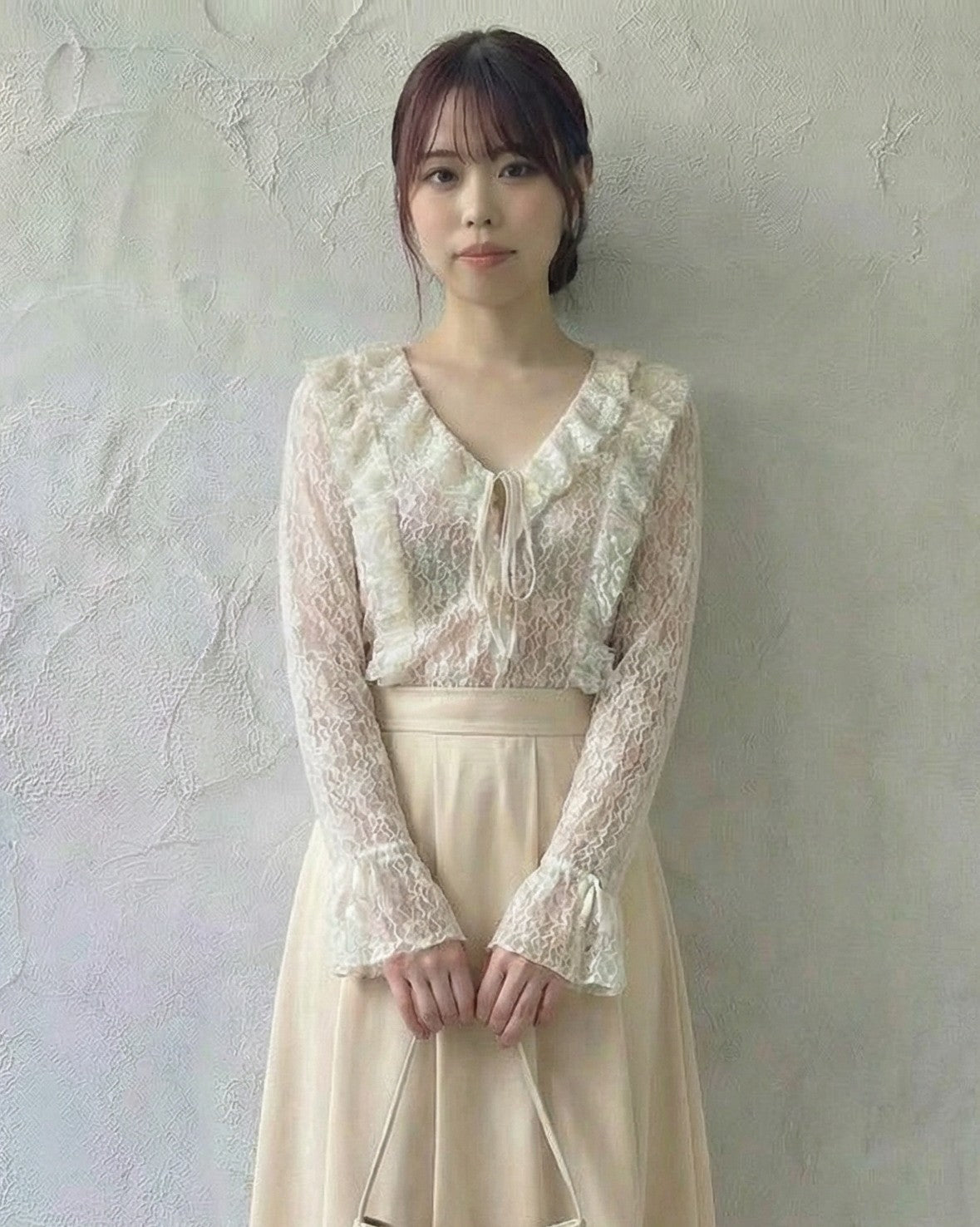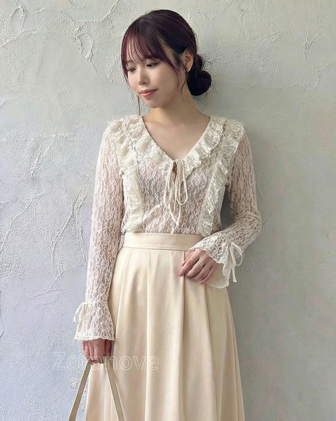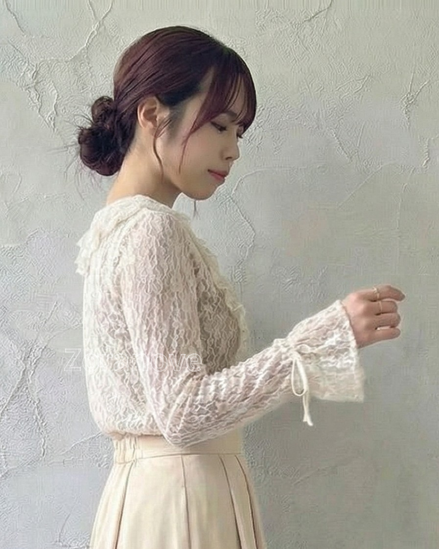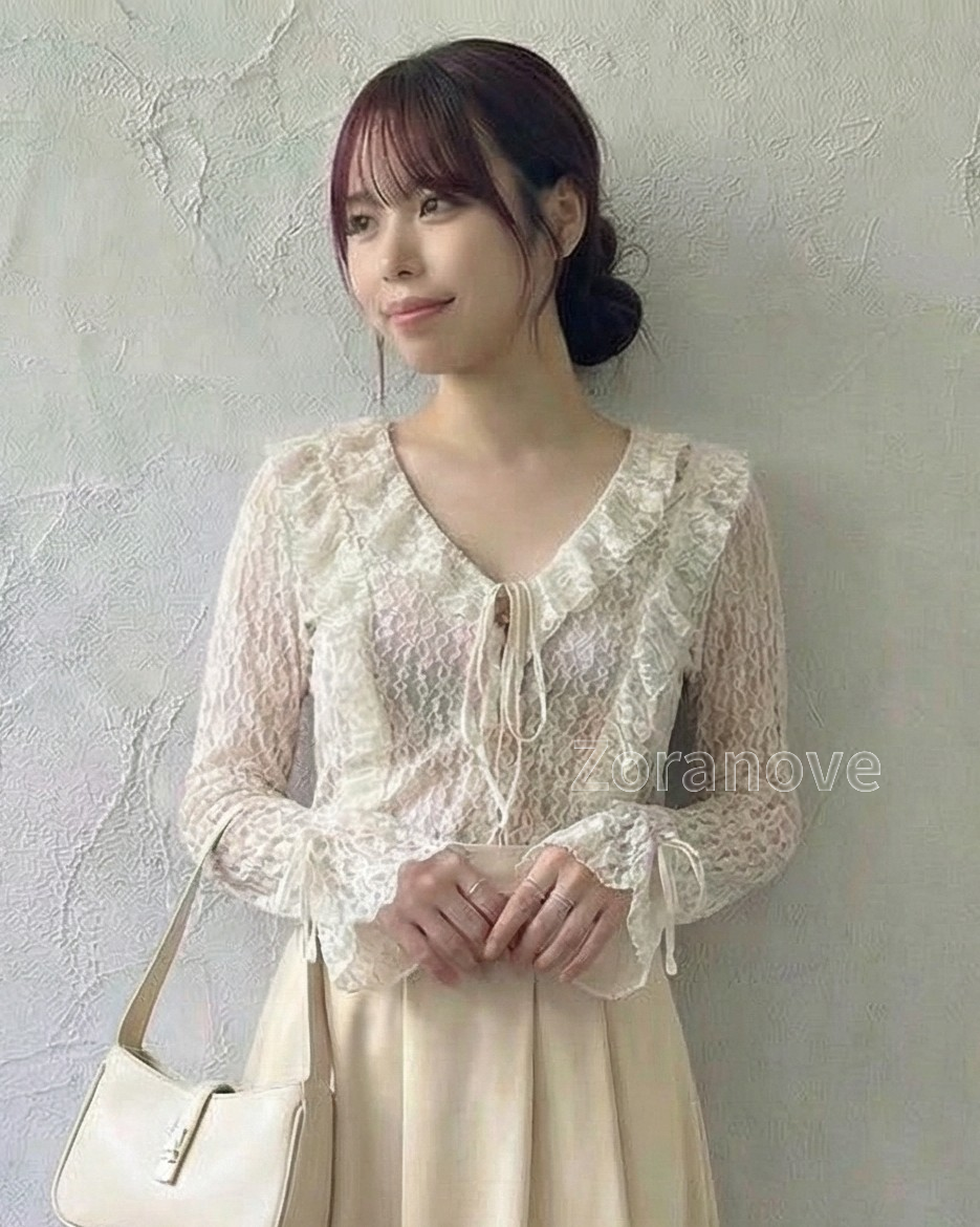蕾絲透視荷葉邊綁帶長袖上衣
