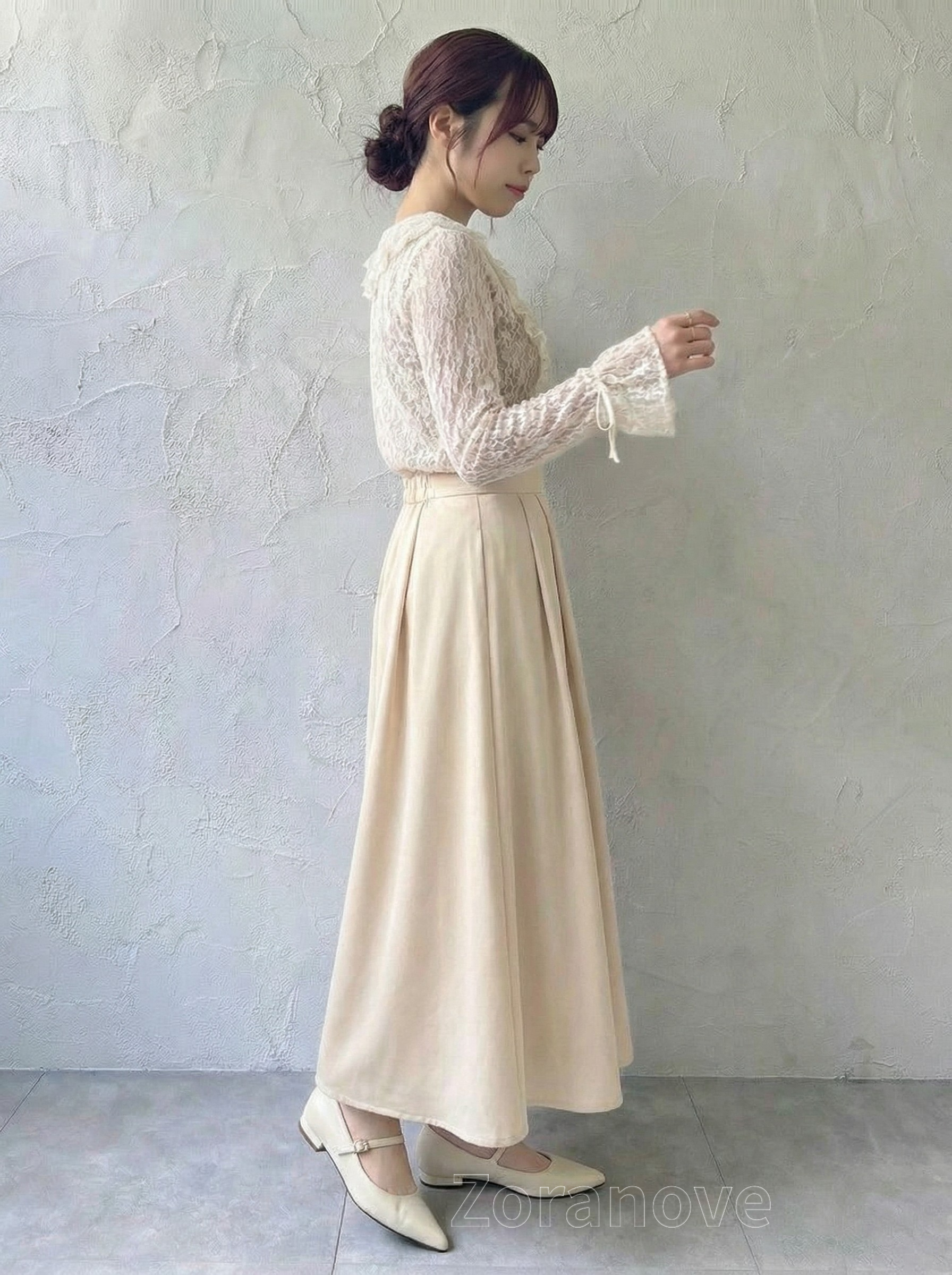 肩線與前襟立體褶邊勾勒縱向線條,弱化平面感,拍照時輪廓更立體分明。
