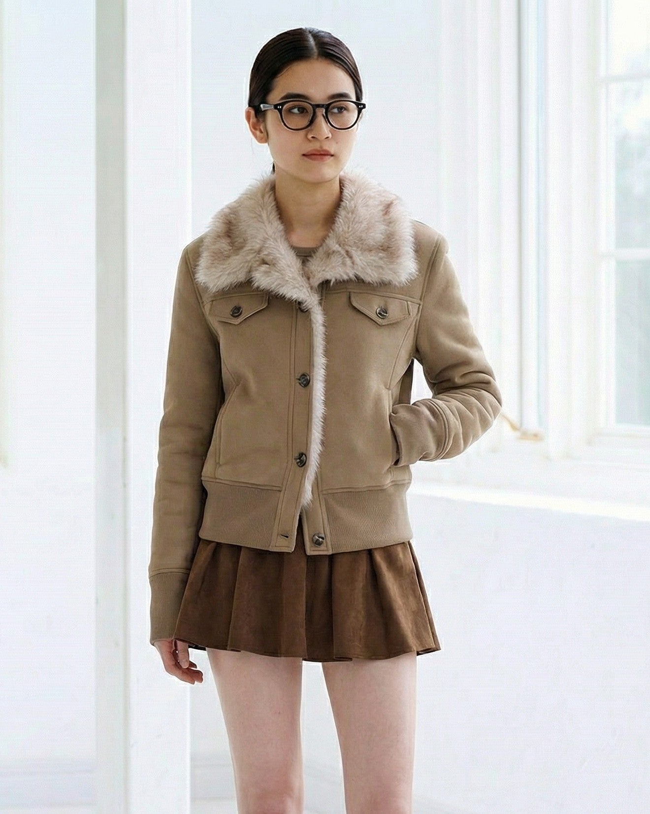 深棕色衣身搭配米白色毛絨翻領與門襟內側滾邊,領口立體包覆,靠近臉部更顯俐落清爽。