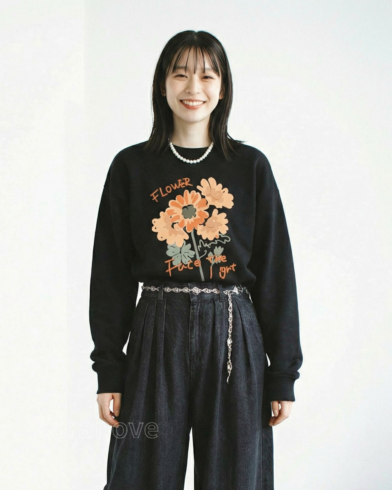 胸前大面積花卉圖案集中於上半身視覺焦點,搭配高腰下裝更能凸顯身材比例。