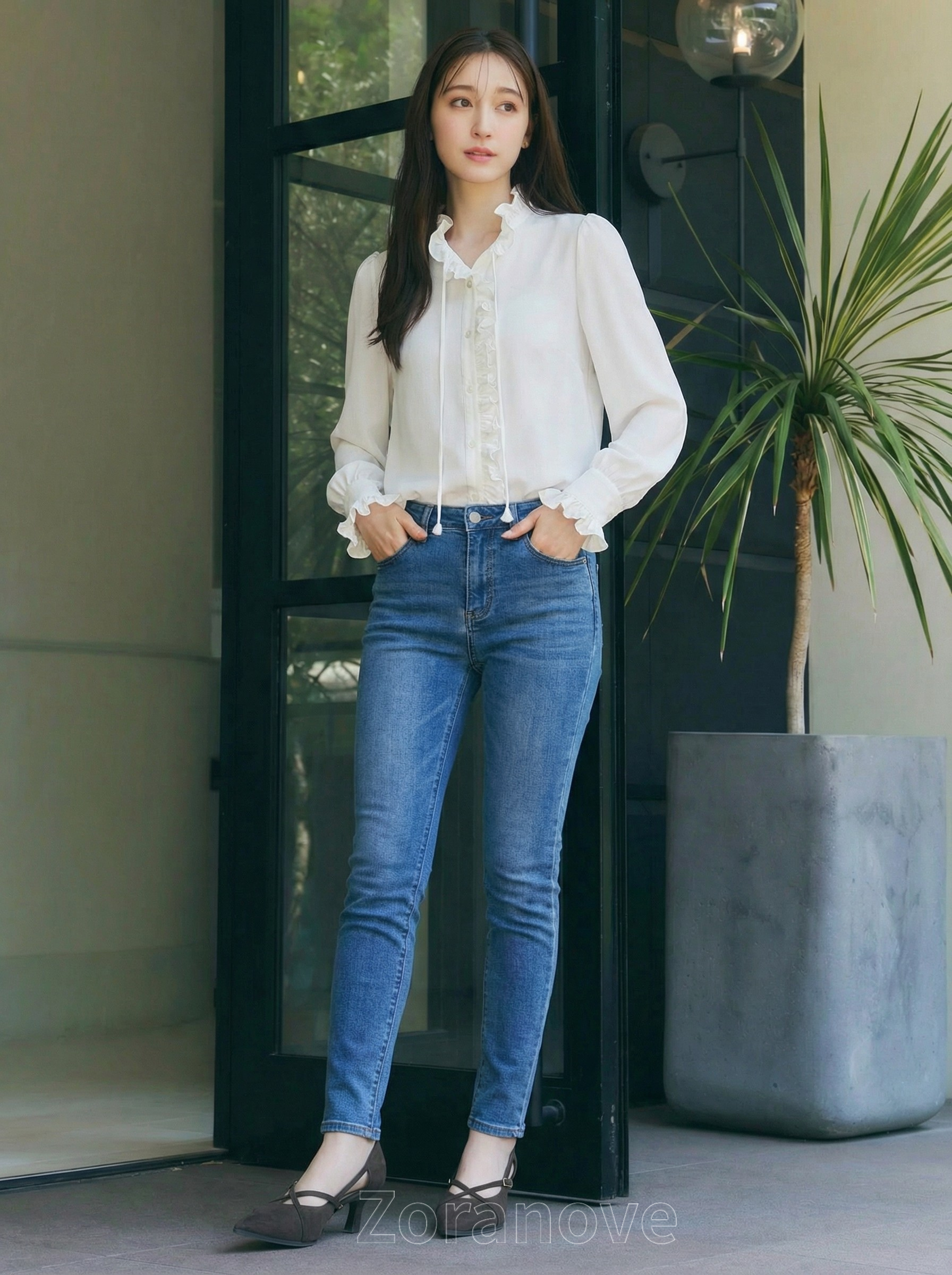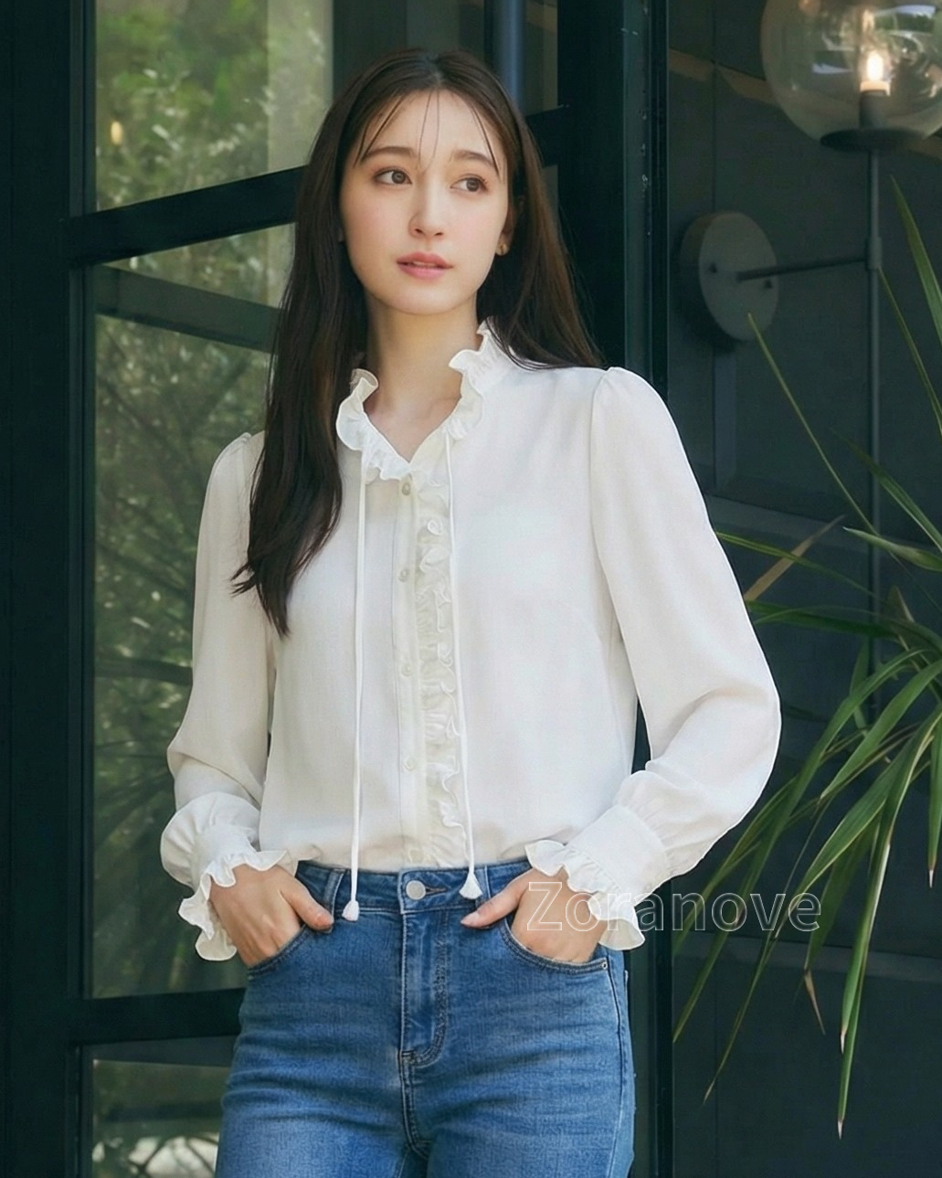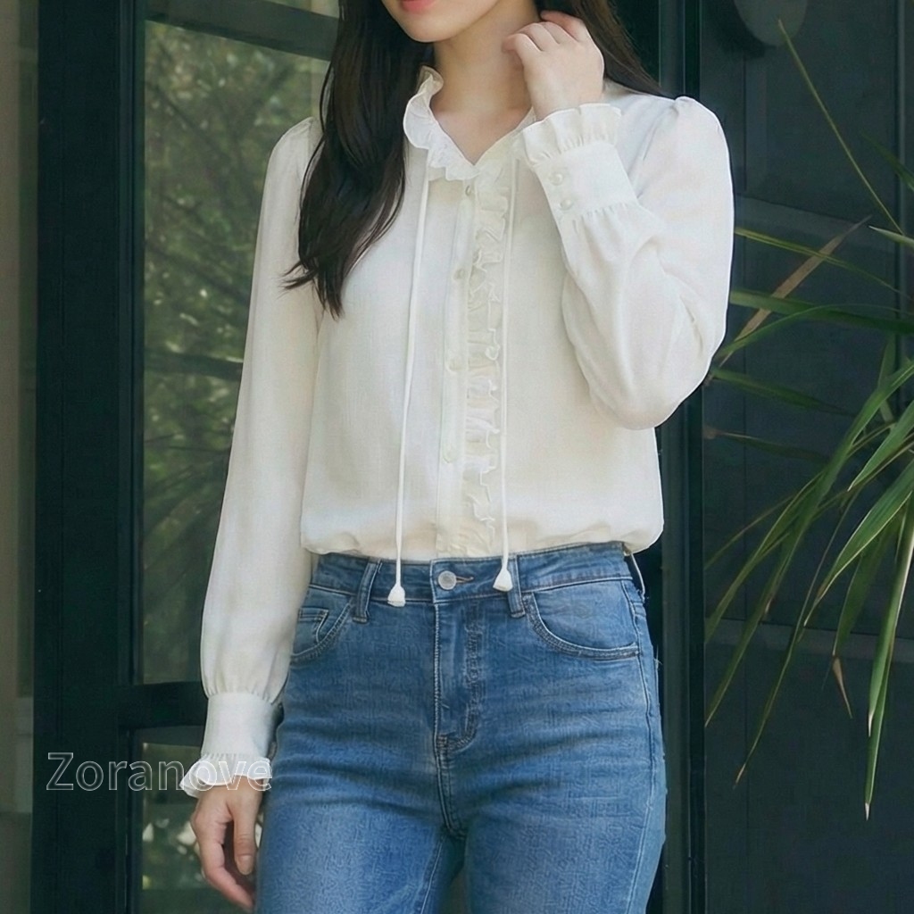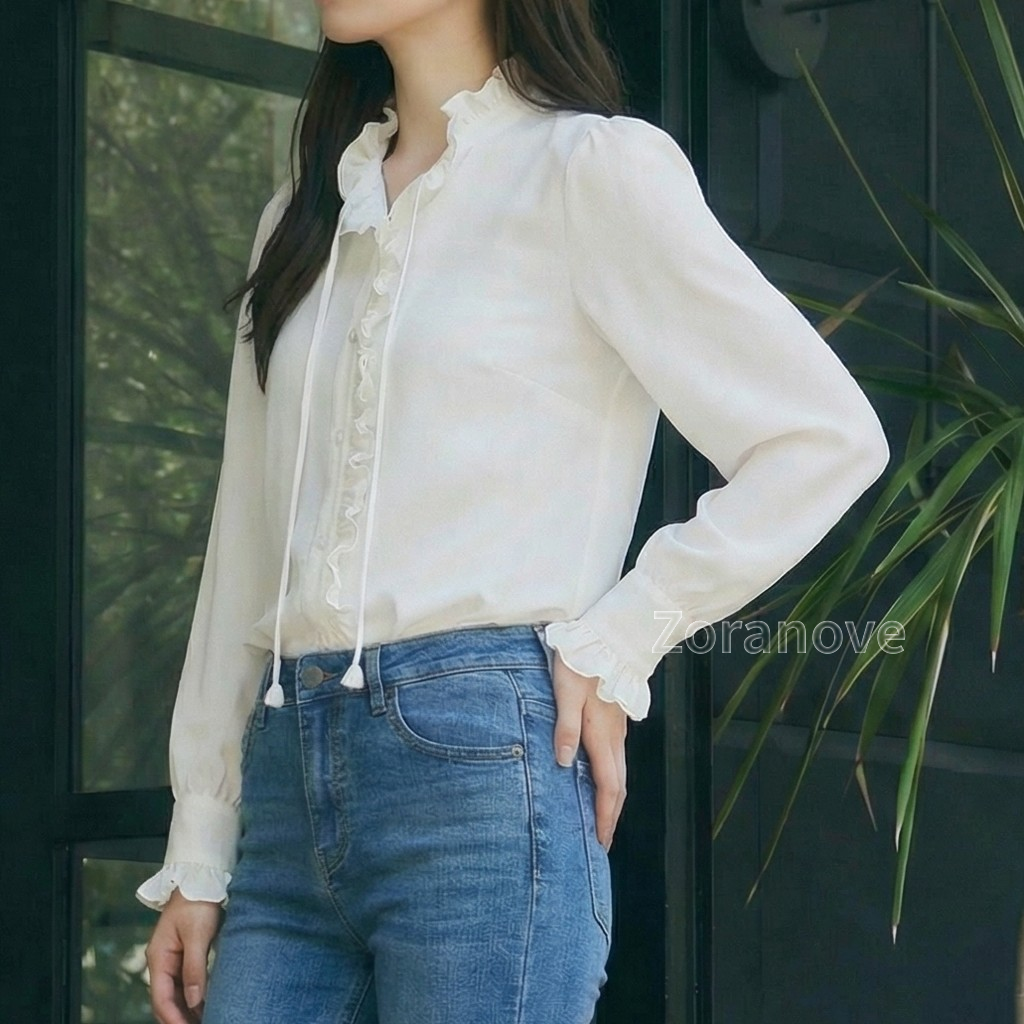 袖口採收褶設計並綴以荷葉邊,若隱若現露出手腕,視覺上更顯纖細;搭配高腰牛仔褲或半裙,無論通勤或約會皆宜。