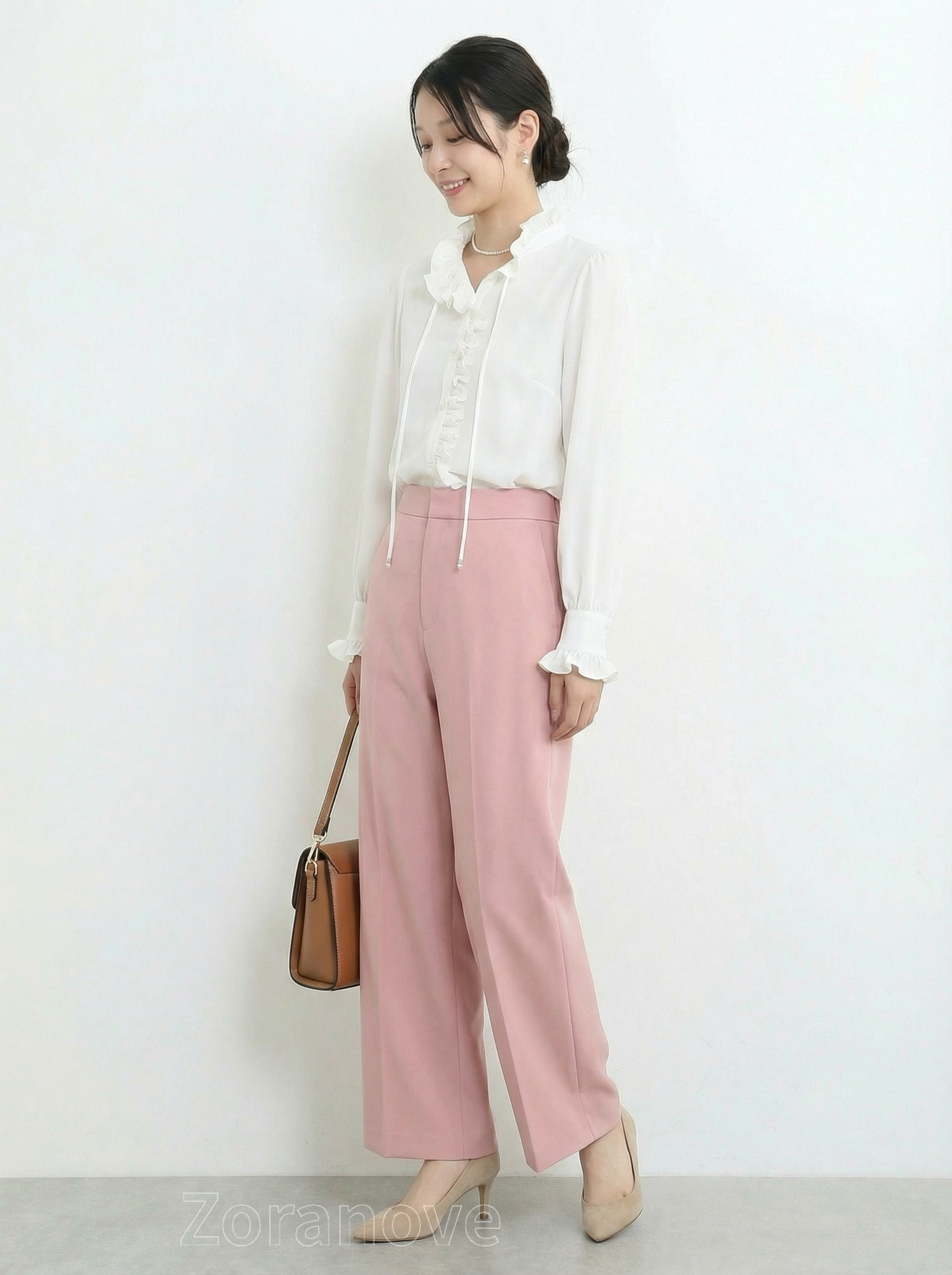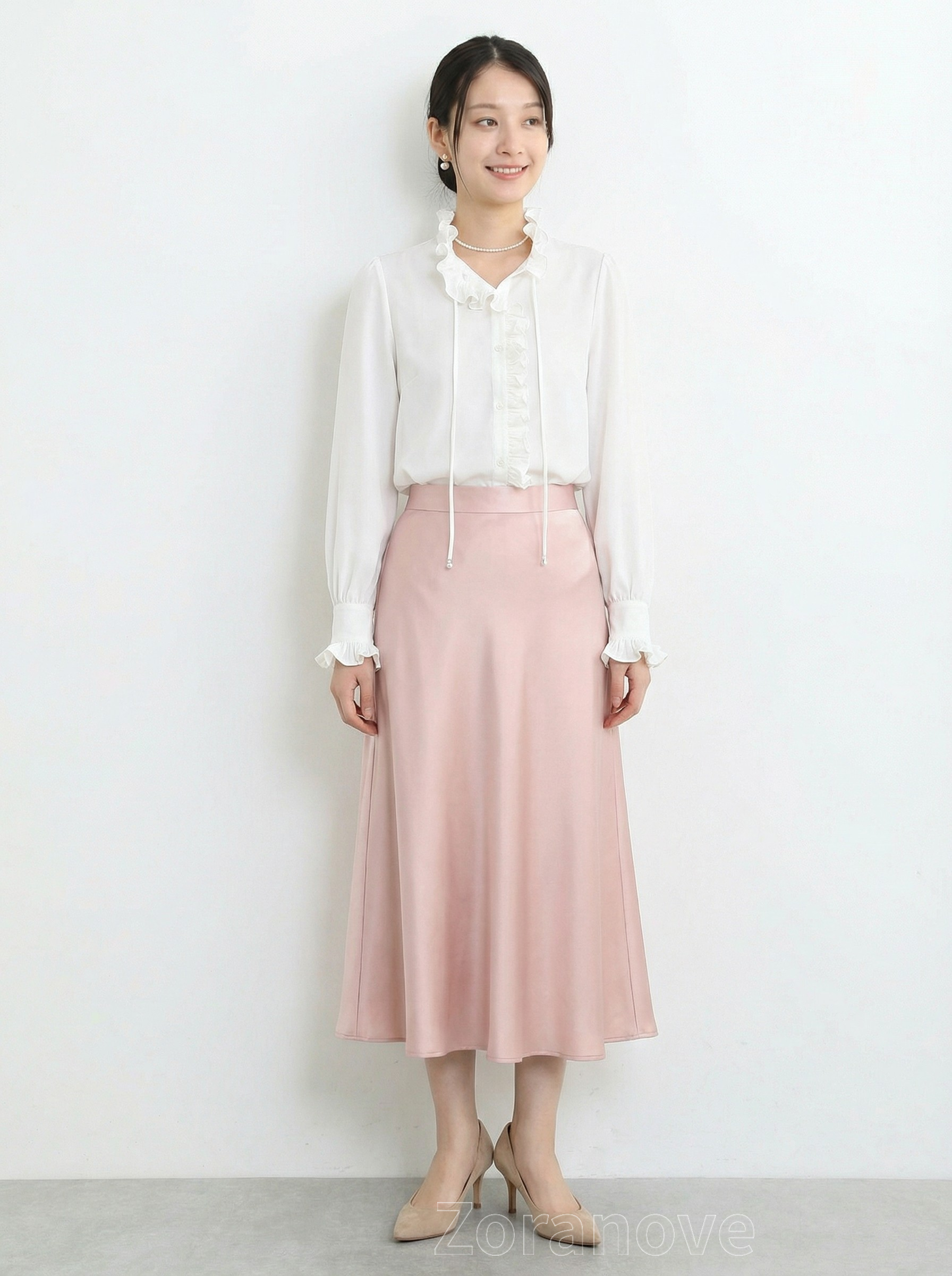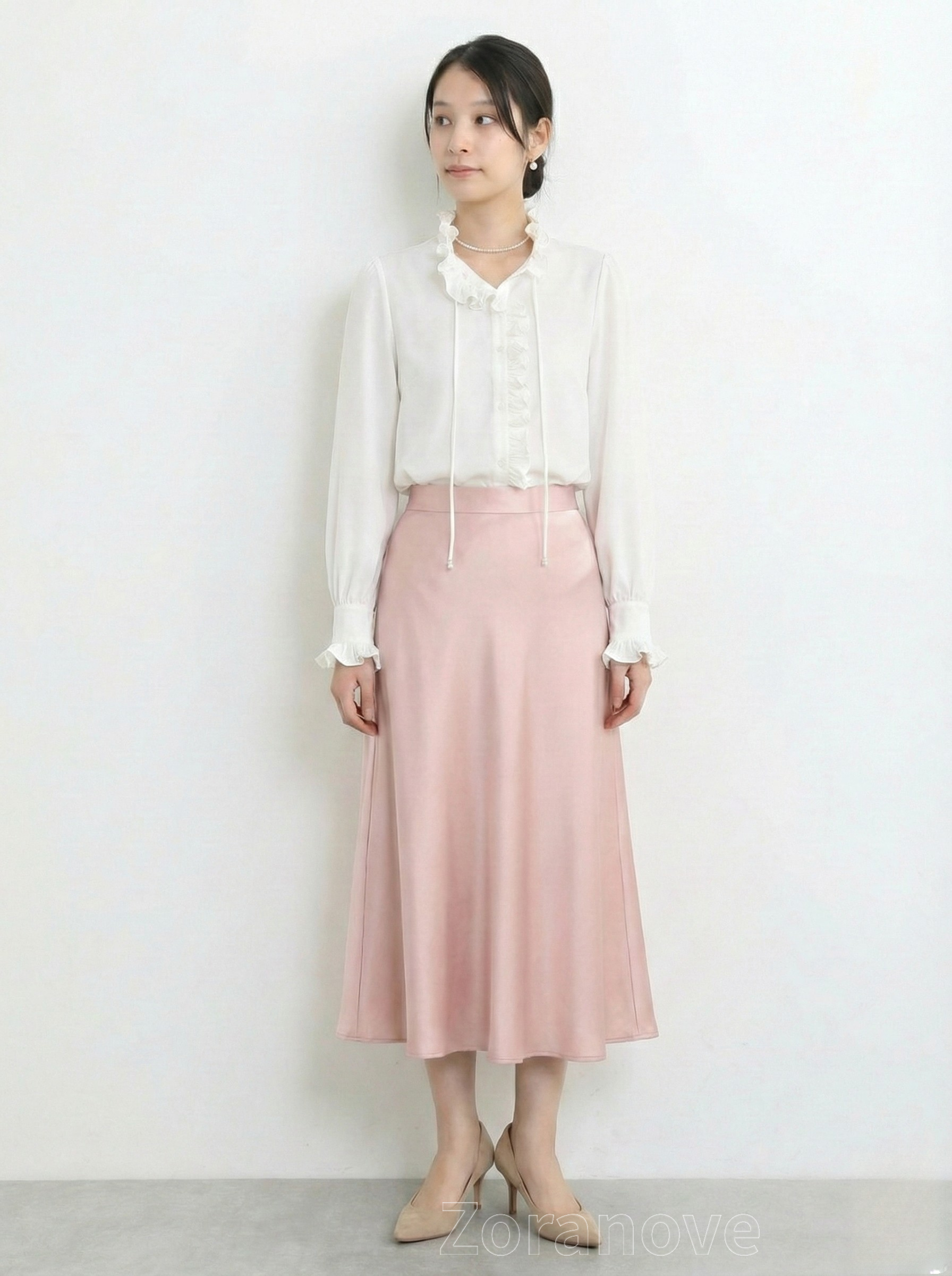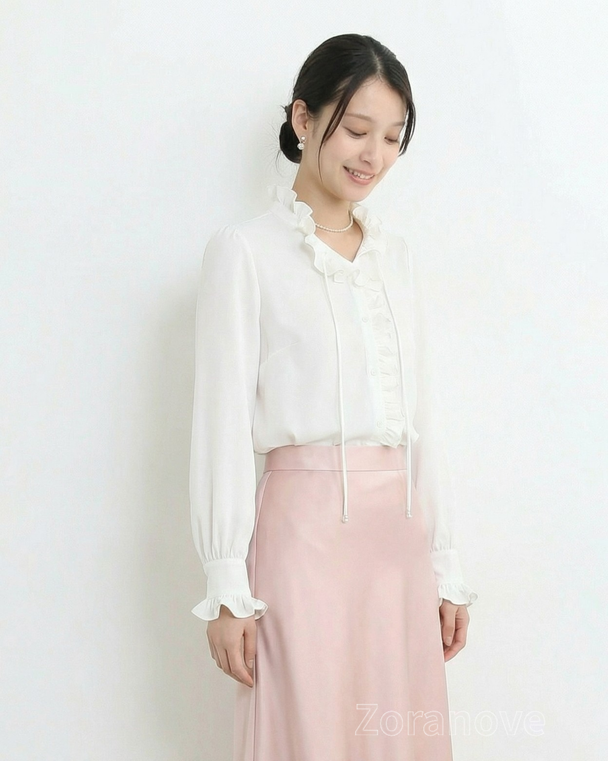 袖口採收褶設計並綴以荷葉邊,若隱若現露出手腕,視覺上更顯纖細;搭配高腰牛仔褲或半裙,無論通勤或約會皆宜。
