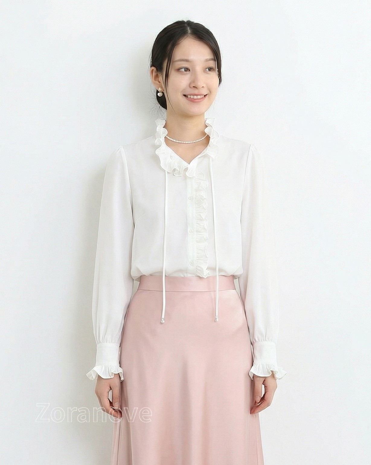 純白色上衣採立領V領設計,領口一圈立體荷葉邊沿頸線自然起伏,修飾臉部輪廓,讓線條更俐落。