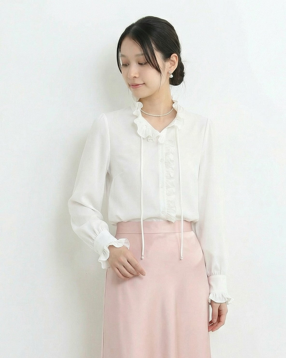 荷葉邊立領綁帶長袖襯衫