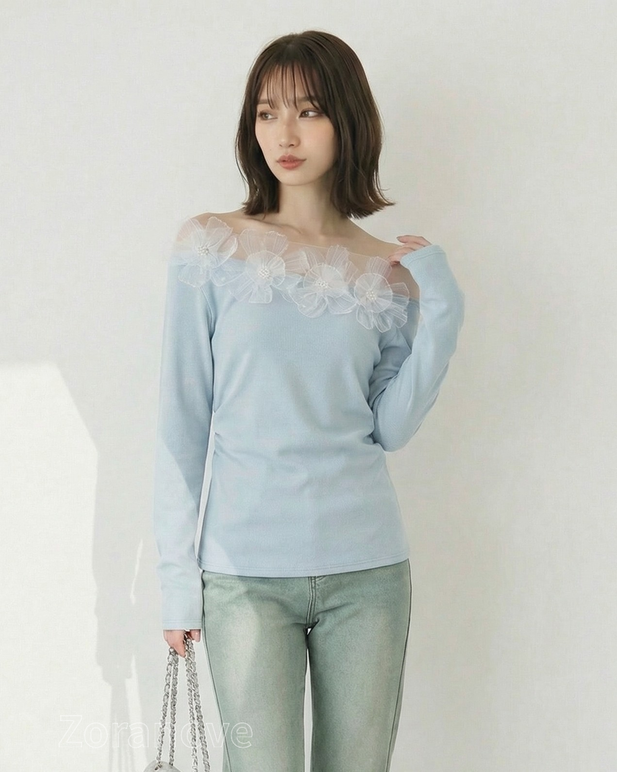 領口一排立體花朵裝飾橫向延伸,豐滿上半身輪廓,拍照更上鏡。