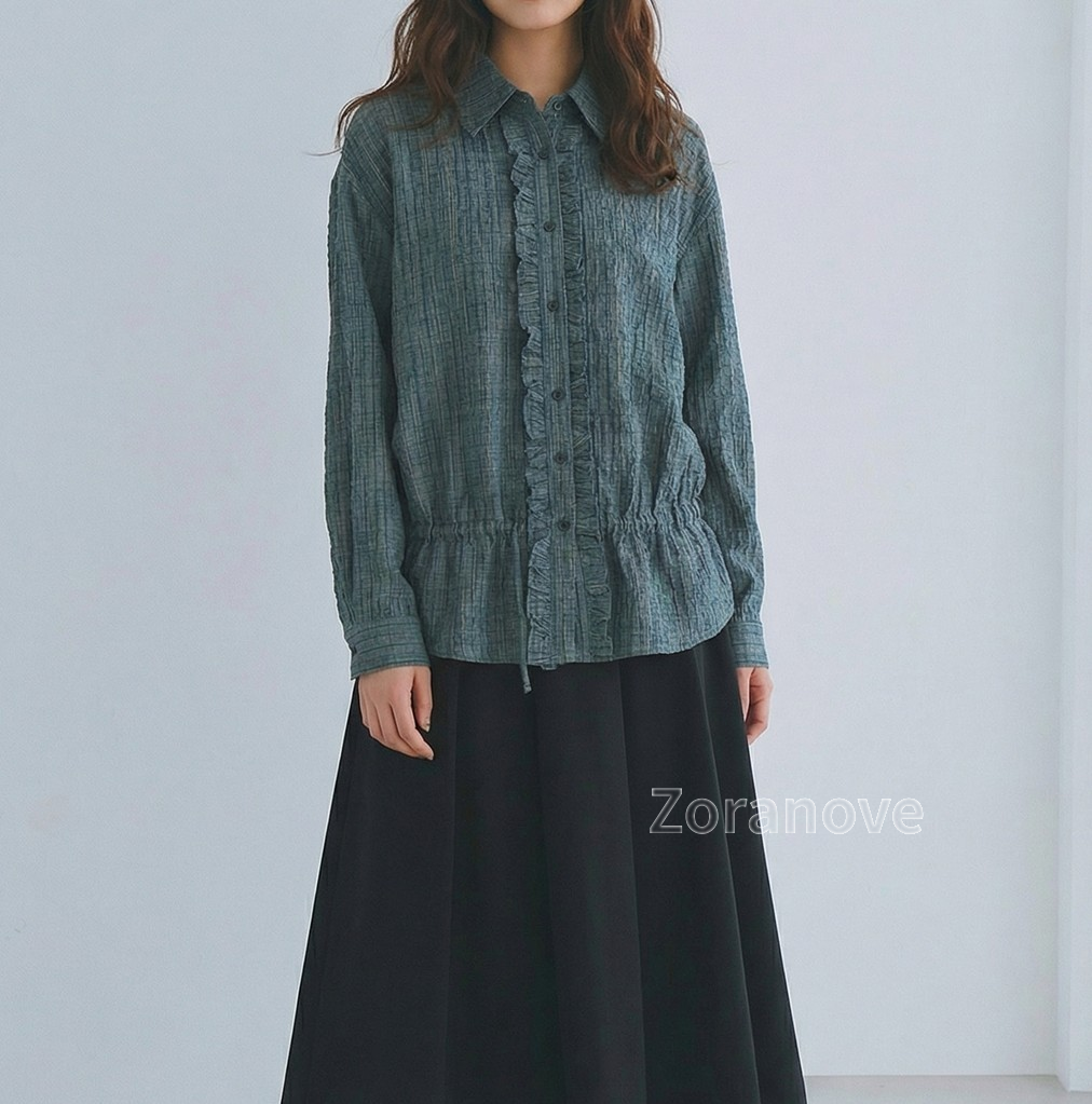 荷葉邊門襟收腰褶皺襯衫