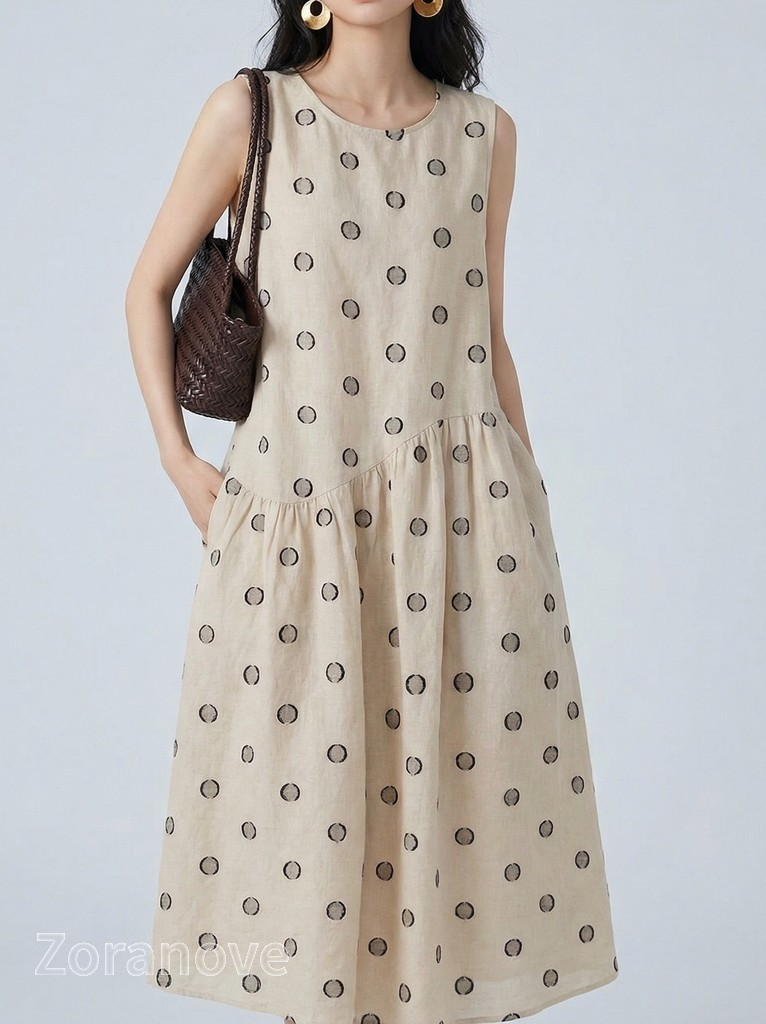 淺米色波點印花寬鬆A字無袖背心洋裝