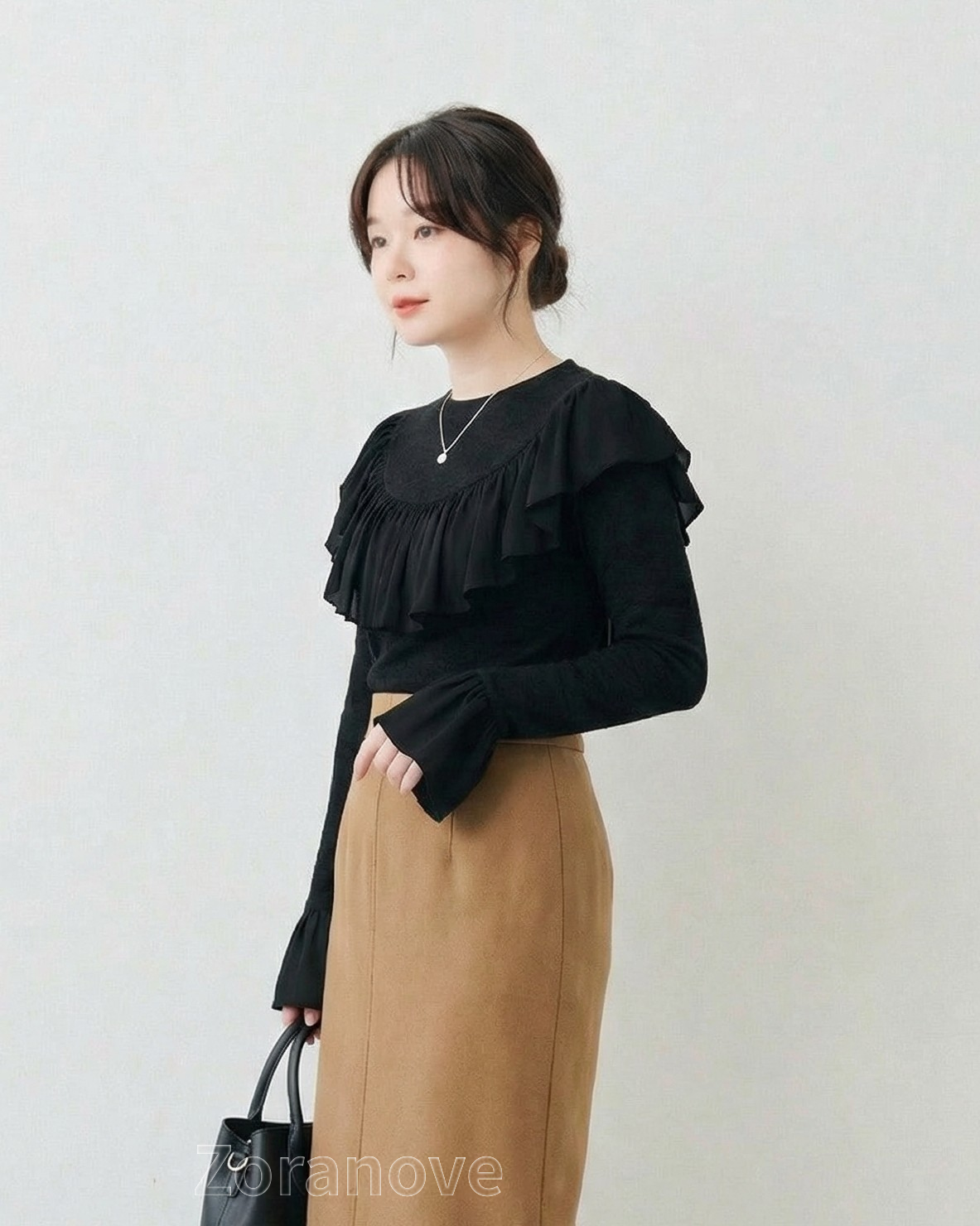 衣身修身且長度適中,方便紮入高腰下裝:搭配皮裙或西裝褲,通勤簡潔利落;配高腰牛仔褲與短靴,則適合約會與夜間出門。