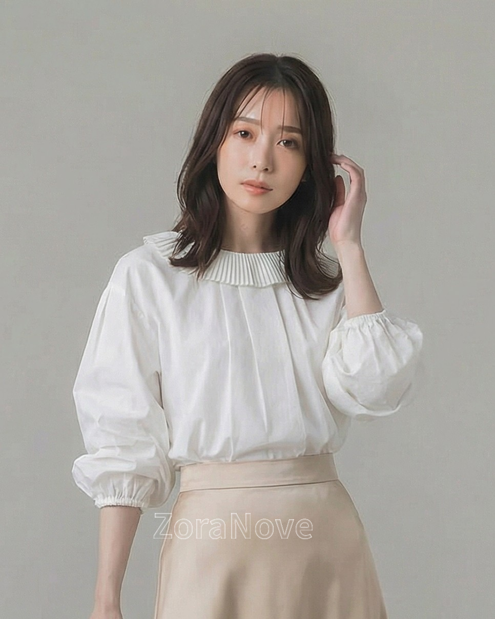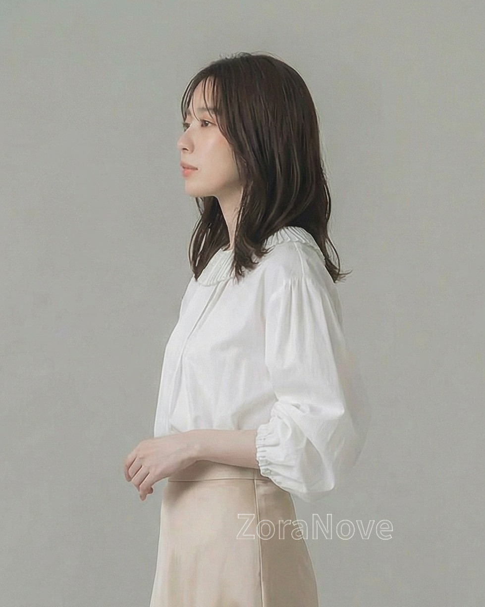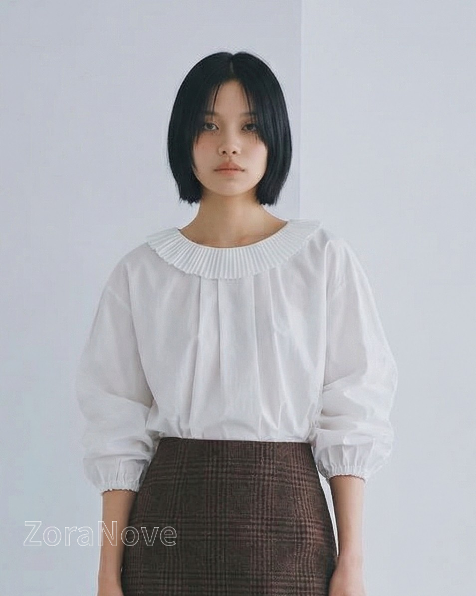 領口一圈細密壓褶荷葉邊沿著肩頸自然展開,正面更突顯臉部留白感,背面則勾勒出柔美輪廓。