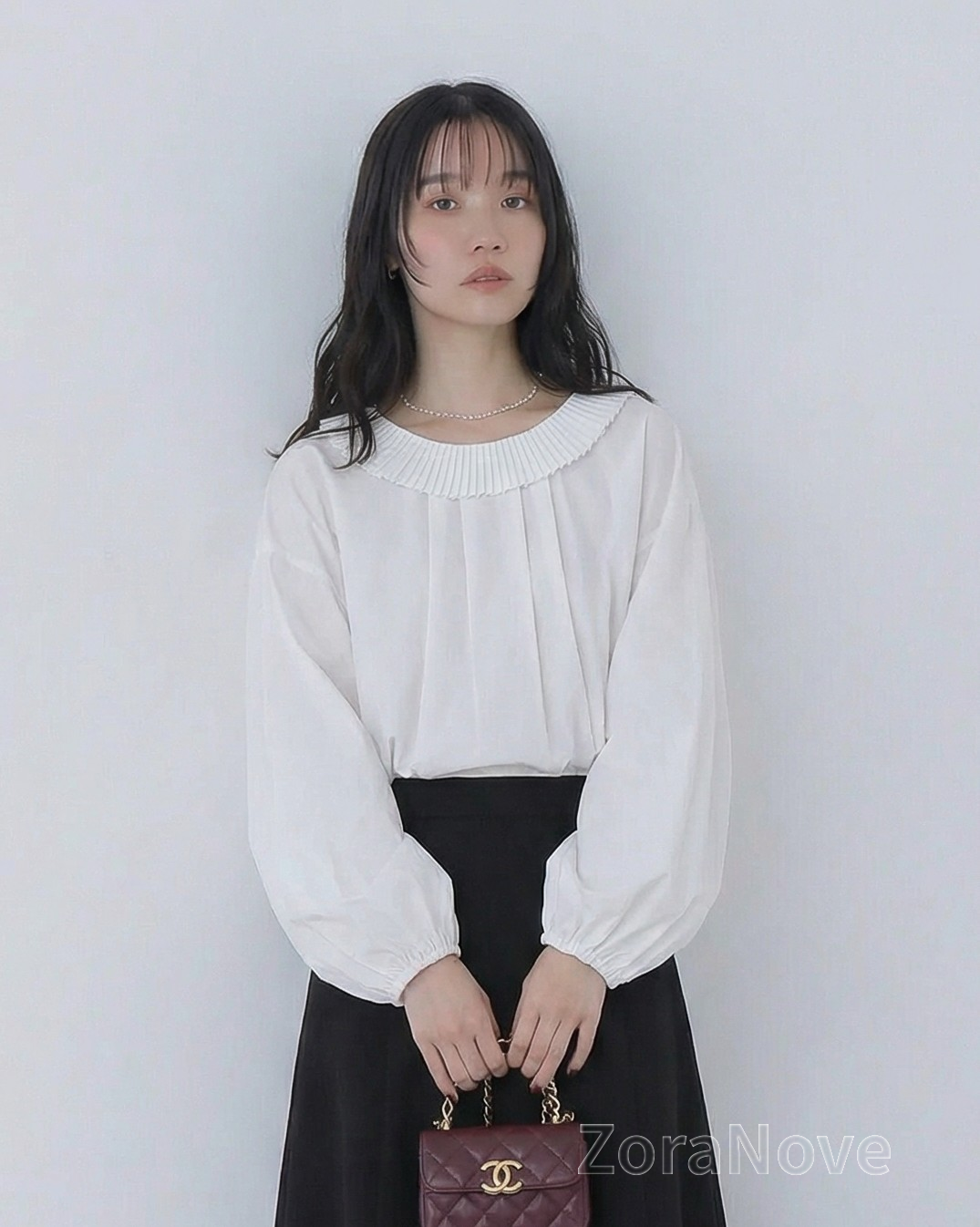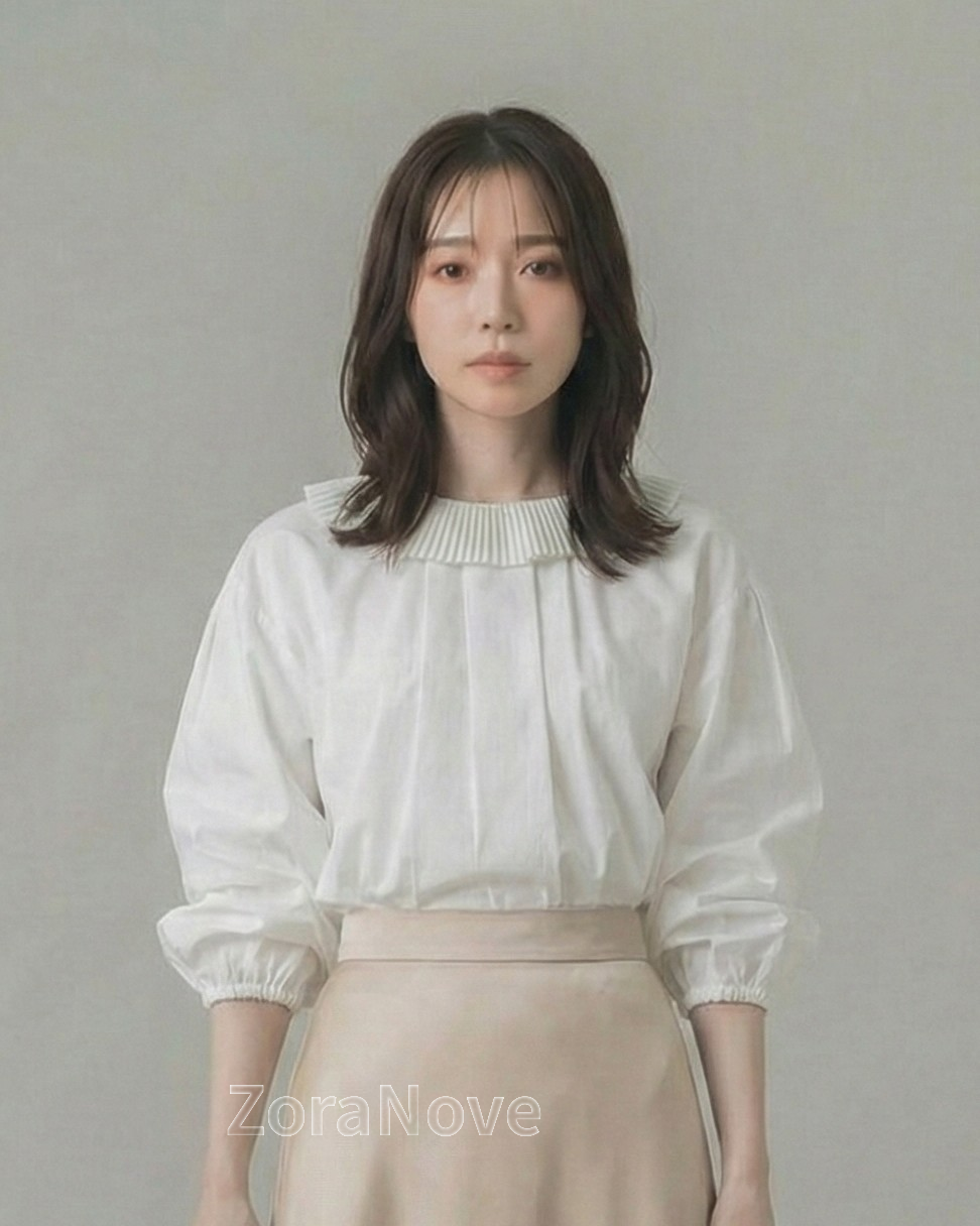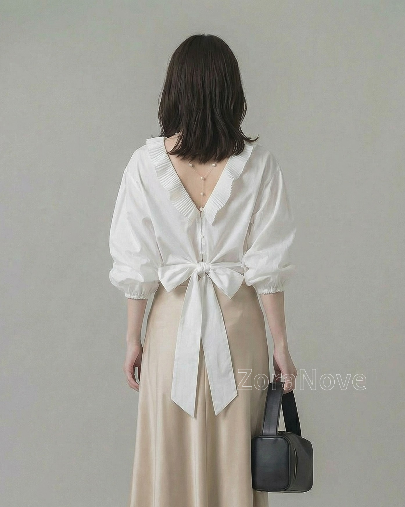領口一圈細密壓褶荷葉邊沿著肩頸自然展開,正面更突顯臉部留白感,背面則勾勒出柔美輪廓。