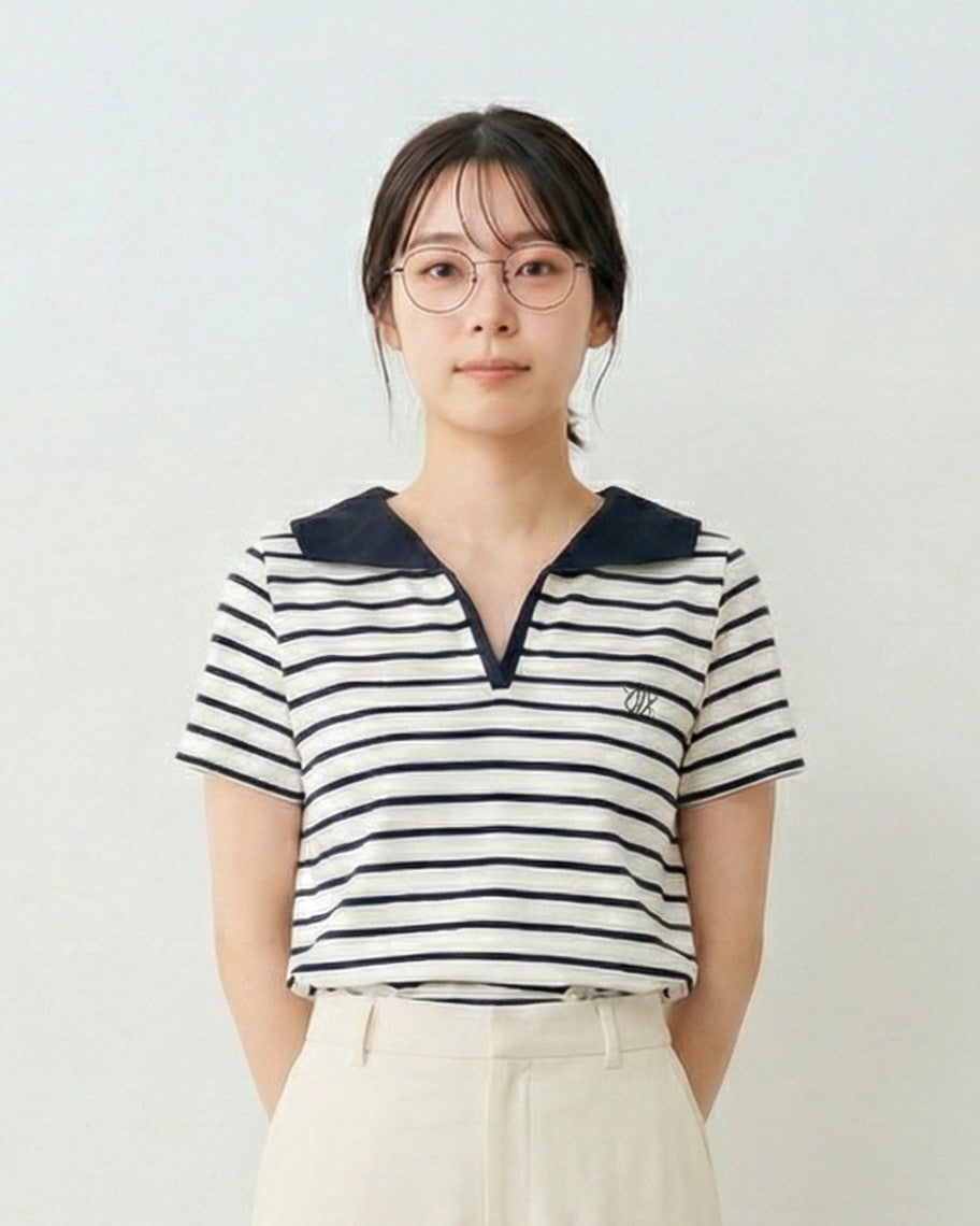 海軍風條紋翻領V領短袖T恤