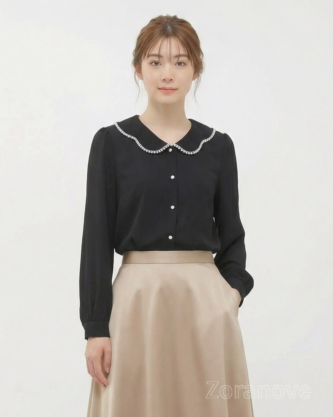 珍珠鑲邊娃娃領燈籠袖襯衫