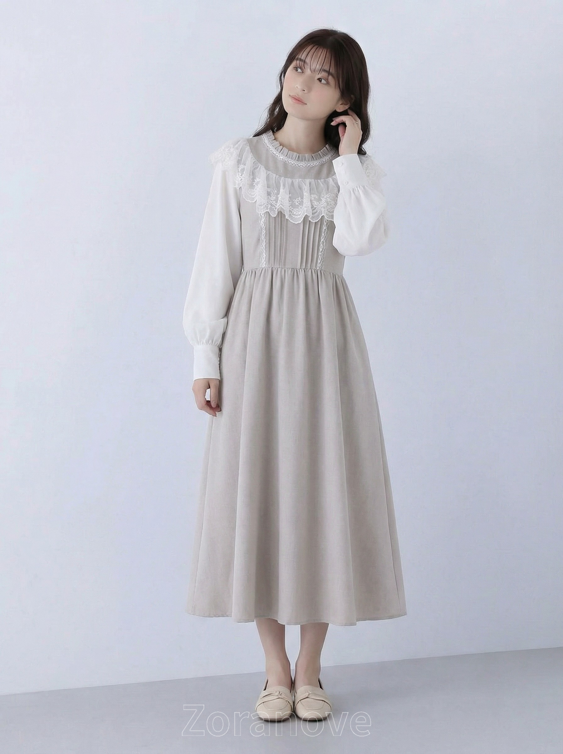 圓領外圈拼接蕾絲荷葉大翻領,柔美覆蓋肩頸線條,視覺上更顯小臉與上半身輕盈俐落。