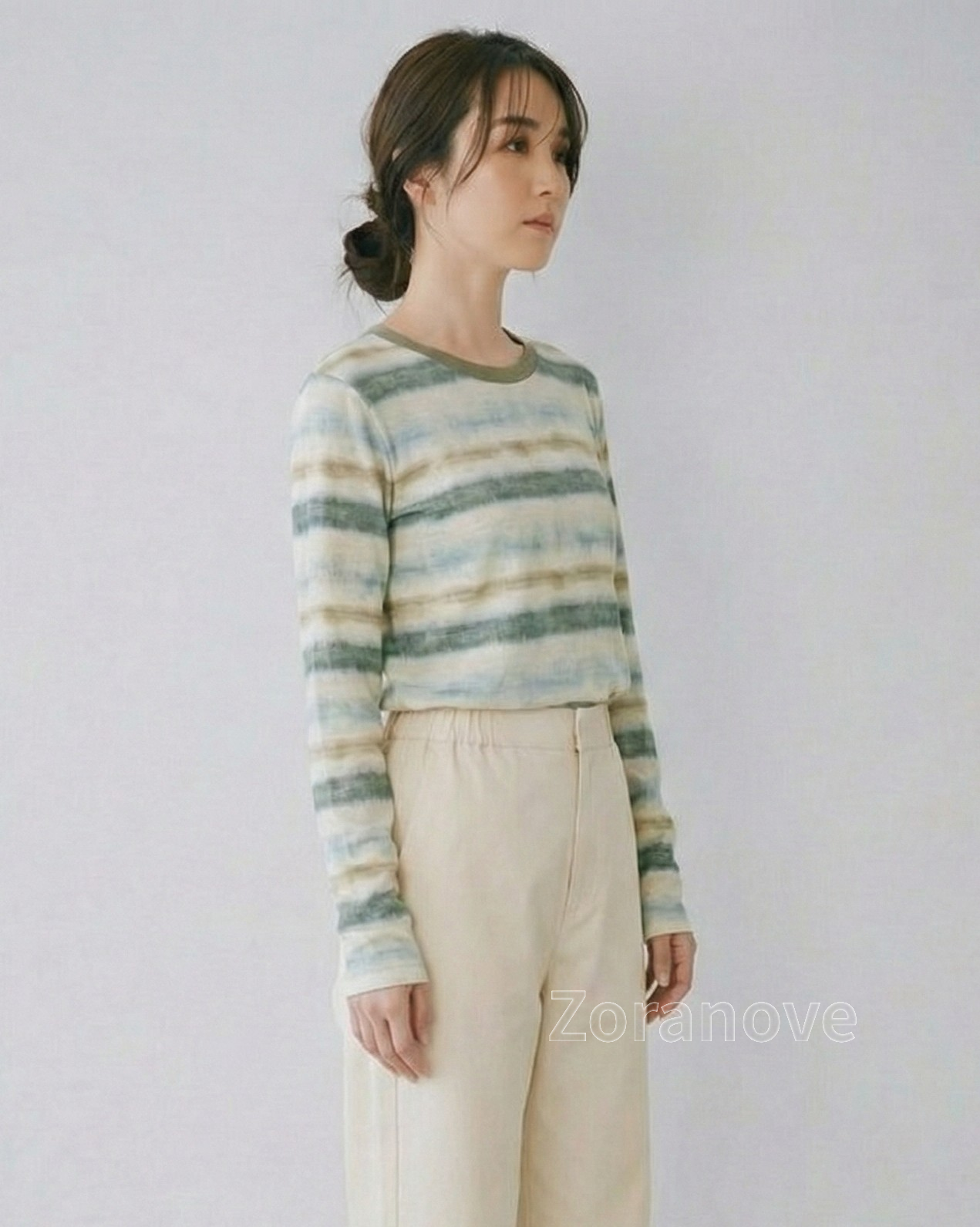 衣身滿版鋪陳以深綠為主調的水彩感橫條紋,色帶漸層柔和,視覺輕盈不僵硬。